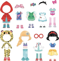 Rochii, pantofi, pălării și accesorii – piesele magnetice se atașează ușor și se schimbă într-o clipă. Copiii își antrenează motricitatea fină și creativitatea.