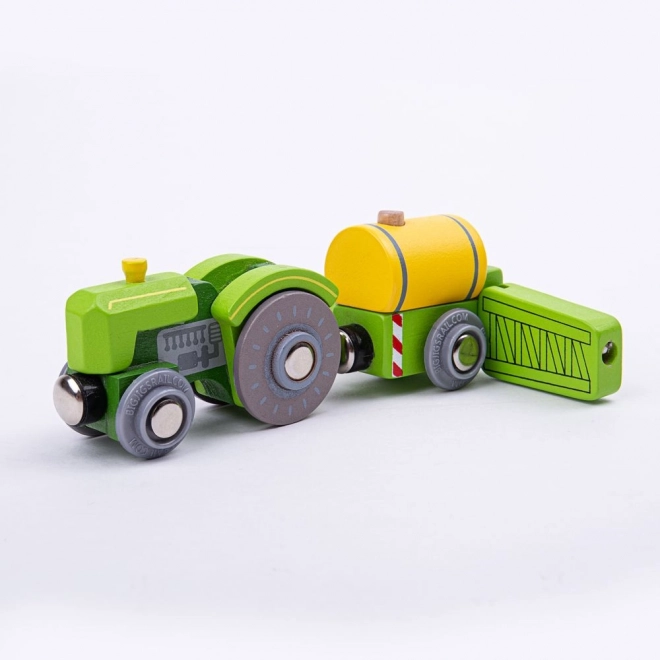 Tractorul verde cu remorcă și pulverizator este un accesoriu grozav atât pentru seturile agricole, cât și pentru circuitele obișnuite de trenulețe. Datorită cuplajului magnetic universal, vagoanele se conectează ușor, extinzând posibilitățile de joacă atât la fermă, cât și pe șine.