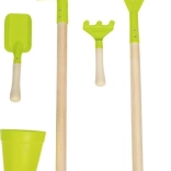 - Setul include greblă, lopată, ghiveci de plastic, cazma și furcă.