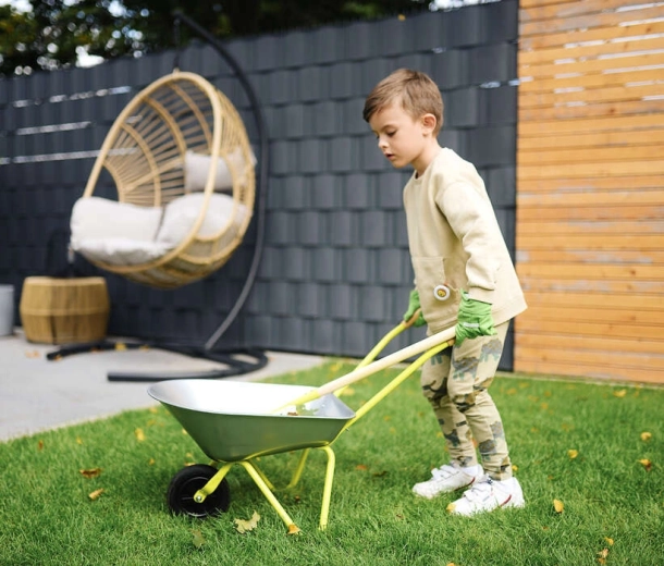 - Ideal pentru joacă în aer liber: greblat frunze, mutat materiale, primele activități în grădină.