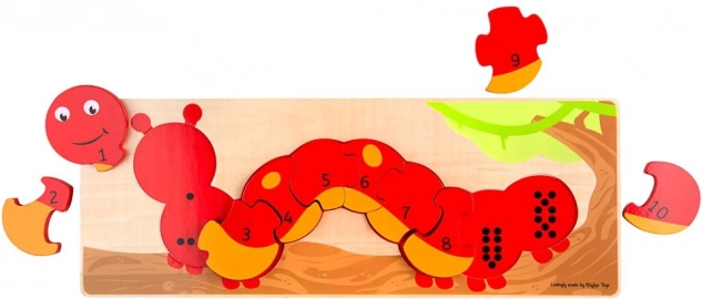 Puzzle-ul de numărat omidă BIGJIGS TOYS îmbină învățarea cu jocul. Copiii așază piesele numerotate 1–10 pe suportul din lemn cu puncte negre, care corespund numărului de pe piesă. Astfel își consolidează înțelegerea cantității, a culorilor și formelor și își antrenează coordonarea mână–ochi.