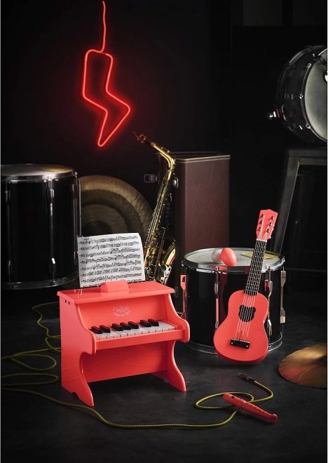 Chitara pentru copii VILAC, într-o nuanță portocalie vibrantă, este ideală pentru primele experiențe muzicale. Oferă execuție de calitate, 6 corzi din nylon și accesorii sub forma unei corzi de rezervă și a unui pană. Excelentă pentru dezvoltarea iubirii pentru muzică și ritm la copiii de la 3 ani. Atenție: este o imitație, nu un instrument muzical complet.