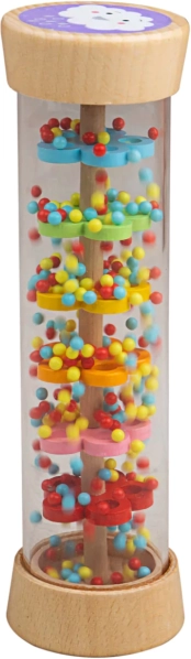 Cilindrul de ploaie Bigjigs Baby este o jucărie senzorială care îi atrage pe cei mici prin foșnetul său liniștitor și culorile vii. În interiorul cilindrului transparent, bilele trec peste discuri colorate, imitând o ploaie fină. Ambele capete sunt decorate cu motive drăguțe de soare și nor, care sprijină percepția vizuală.