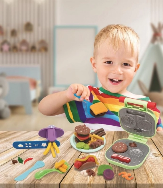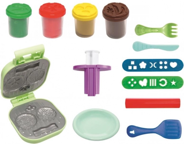 - 4 pachete de pastă de modelare, fiecare cântărind 56g, ideală pentru modelarea diferitelor părți ale hamburgerului.