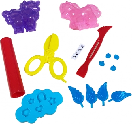 Diverse forme și unelte, inclusiv o foarfecă și o matriță de decorare, permit crearea detaliilor și a decorurilor. Copiii se vor distra pe săturate la fiecare activitate creativă.