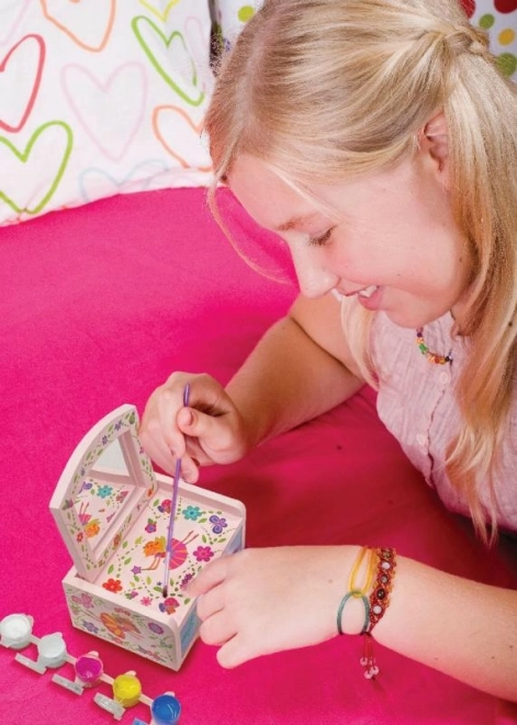 Descoperă bucuria creației cu această cutiuță cosmetică uimitoare. Acest set îți permite să vopsești și să decorezi propria cutiuță pentru mici comori, ideală pentru copii creativi.