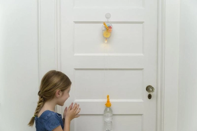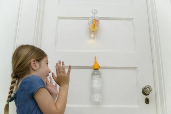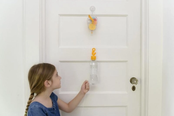 Agățați greutatea și urmăriți cum căderea transformă energia gravitațională în lumină. O demonstrație excelentă de fizică aplicată, pe care copiii o înțeleg imediat.