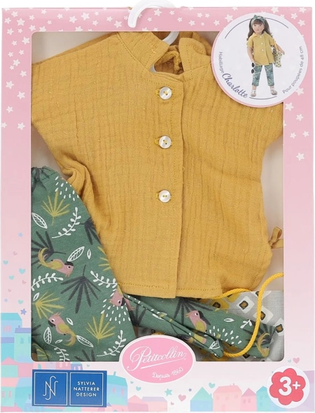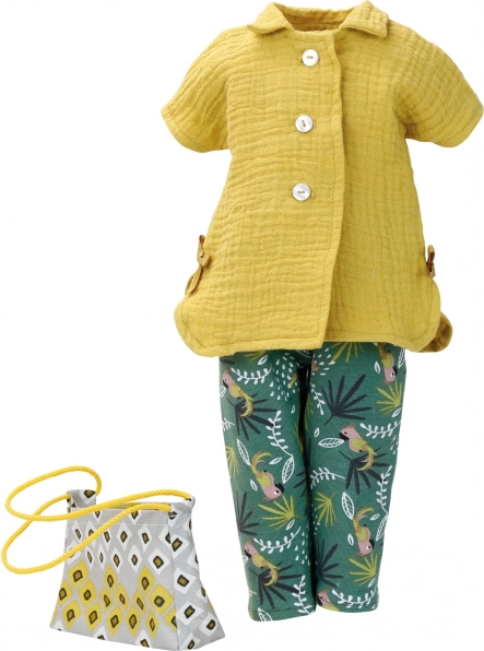 Set elegant de hăinuțe pentru păpușile PETITCOLLIN din gama Finouche, mărimea 48 cm. Include o bluză ocru, pantaloni verzi cu model tropical, geantă stilată și bentiță asortată. Prelucrare de calitate, eleganță franțuzească și design inconfundabil care va încânta orice mică stilistă.