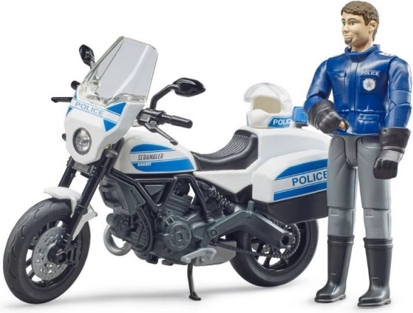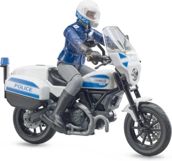 Motocicleta de poliție DUCATI Scrambler de la Bruder este un model elaborat pentru micii și marii fani ai serviciilor de salvare. Motocicleta are ghidon rotativ pentru manevrare ușoară și cric rabatabil pentru staționare stabilă. Figurina polițistului are membre mobile, astfel încât poate fi așezată în poziție de condus sau lângă vehicul.