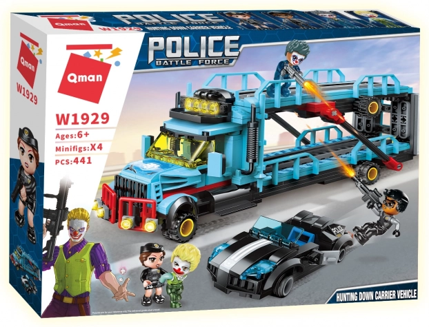 Intrați în lumea intervențiilor polițienești cu setul detaliat Qman Police Battle Force. Camionul hoților cu două niveluri este pregătit de fugă, dar echipa voastră în mașina rapidă este cu un pas înainte. Datorită celor 441 de piese, vă veți bucura atât de construit, cât și de joacă, cu multiple posibilități de reconstrucții și scenarii.