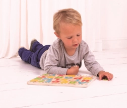 Acest alfabet din lemn cu imagini este o jucărie educativă ideală pentru preșcolari. Copiii învață să recunoască formele literelor și ordinea corectă a acestora, în timp ce își exersează motricitatea fină introducând piesele în placă. În interiorul fiecărei litere se află o imagine tematică a unui animal care începe cu litera respectivă, ceea ce susține vocabularul și învățarea naturală.