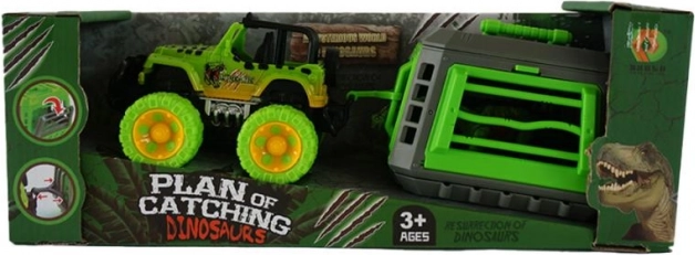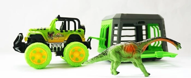 Jeep cu remorcă și dinozaur, fabricat din plastic. Dinozaurul este detașabil, iar remorca se poate desprinde.