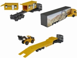 Model metalic licențiat Volvo transporter oferă 3 tipuri de execuție: cu remorcă și încărcător pe roți, cu 2 containere de construcții sau ca camion cu remorcă detașabilă. Datorită șasiului metalic robust și execuției de calitate, rezistă la joacă intensă. Lungime 20 cm.