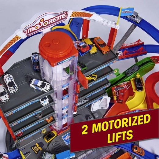 Acest set mare de garaj oferă copiilor posibilități nesfârșite de joc pe cele șapte etaje. Pistele spiralate colorate, liftul acționat pe baterii și efectele luminoase și sonore realiste îi vor captiva pe toți pasionații de mașini și trenuri. Mașinuțele metalice cu roți care se rotesc liber rulează lin pe rampe, în timp ce locomotiva cu vagon trece printr-un tunel secret și oprește la stația feroviară.