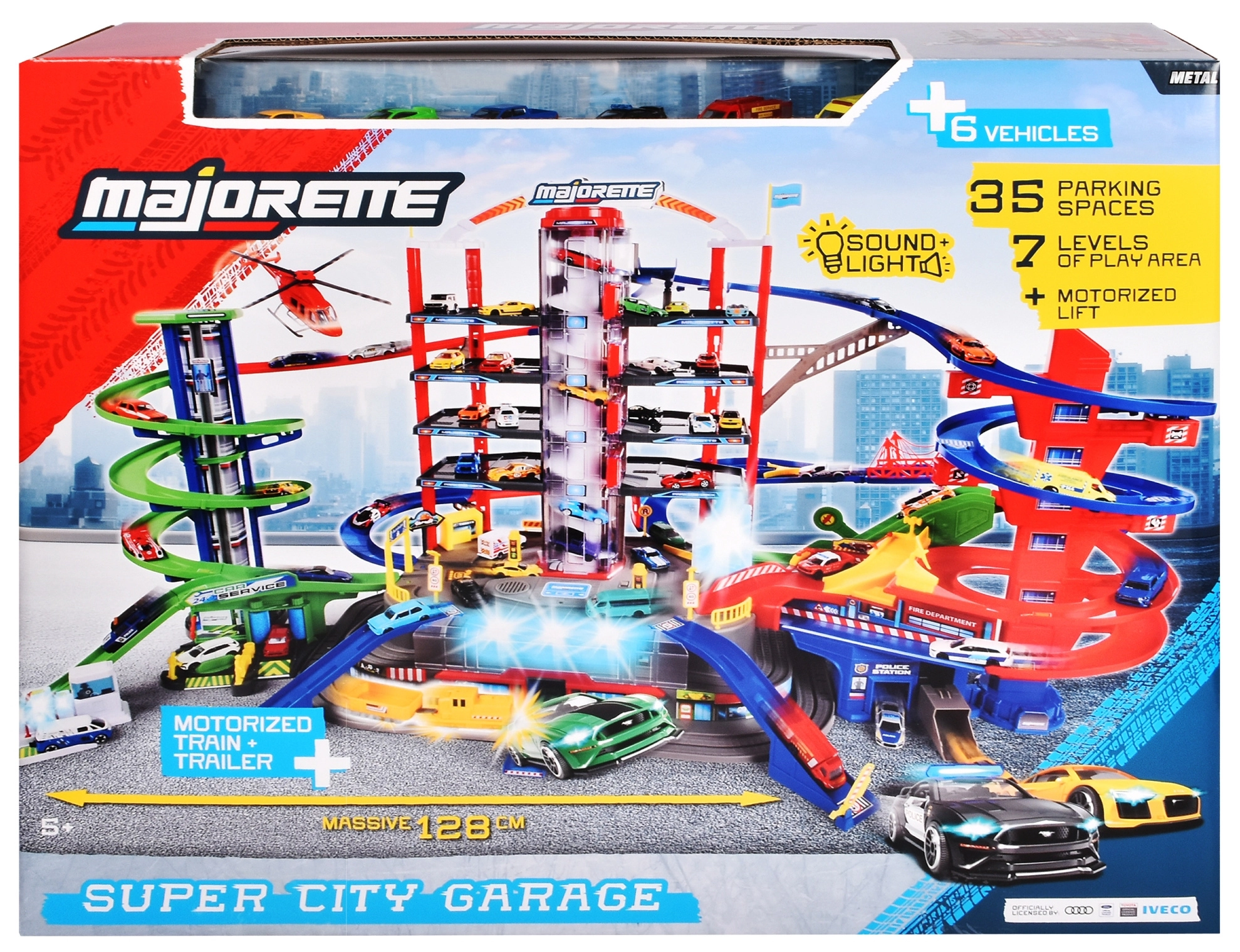 Descoperă mega-setul pentru micii șoferi: complexul de garaj Super City pe 7 etaje cu lift, rampe spiralate și 6 mașinuțe metalice completate de o locomotivă cu efecte de lumină și sunet. Nu lipsesc heliportul, stația de poliție și pompieri, spălătoria și stația de alimentare cu sunete și lumini – totul pentru ore întregi de joacă creativă și plină de acțiune.