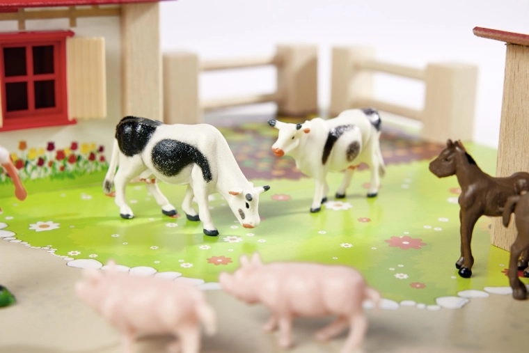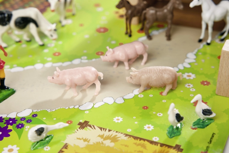 Cai, vaci, purceluși, gâște și îngrijitoarea stimulează imaginația, îi învață pe copii să recunoască speciile de animale și dezvoltă abilitățile sociale prin joc de rol.
