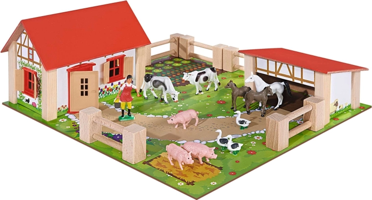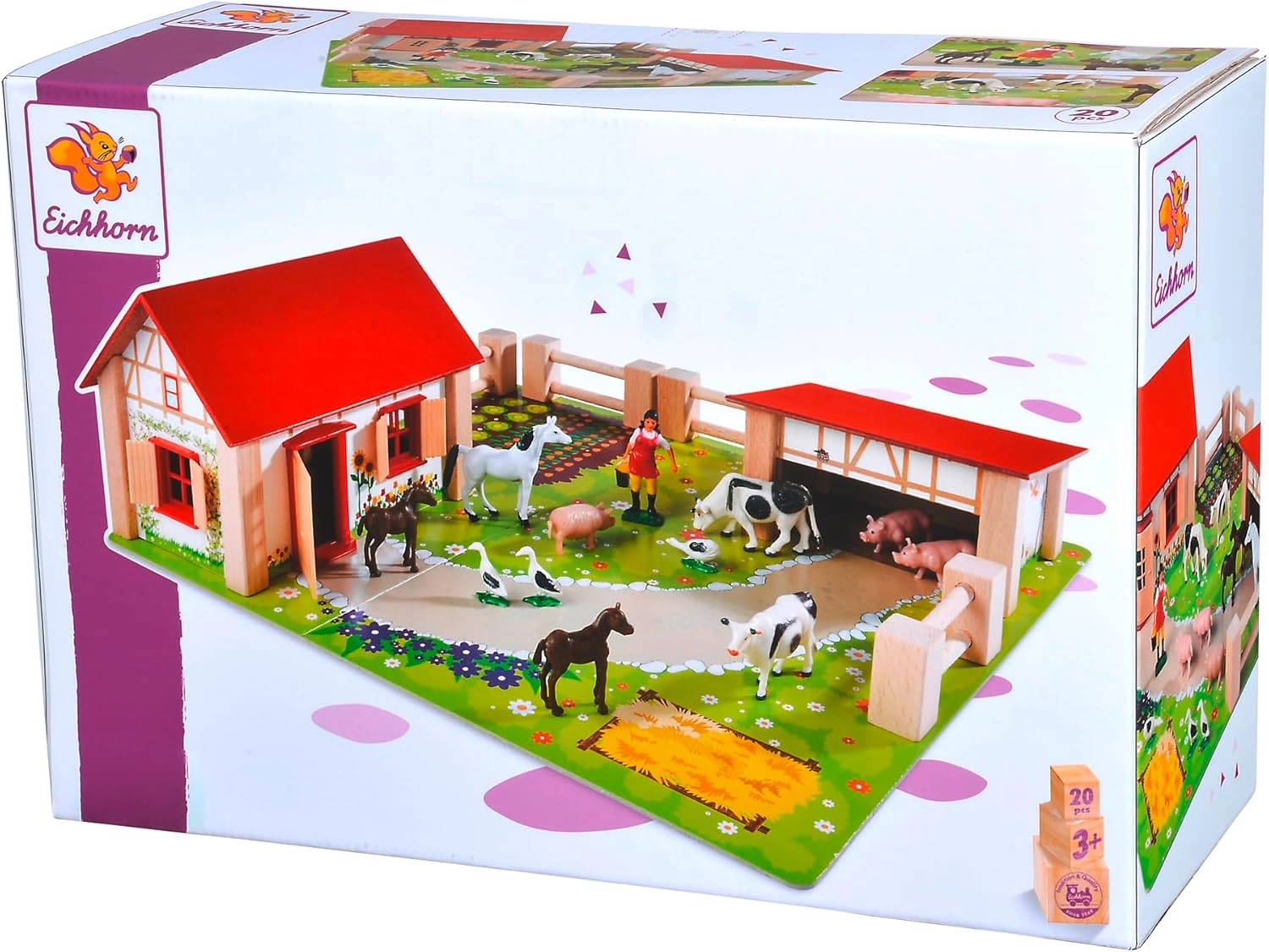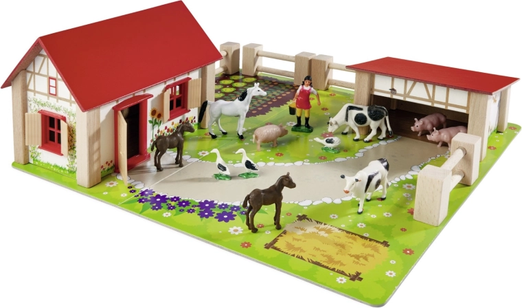 Ferma din lemn EICHHORN îi va încânta pe toți micii fermieri. Setul include o căsuță cu acoperiș roșu, grajd, garduri și figurine detaliate de animale, inclusiv căluți, văcuțe, purceluși și gâște. De asemenea, conține un covoraș colorat cu poteci și grădină, care îi ghidează ușor pe copii în crearea propriilor scenete și povești. Construcția solidă din lemn și materialele rezistente asigură o durată lungă de viață și joacă în siguranță.