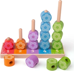 Fiecare stâlp are propriul număr și propria culoare, astfel încât copiii înțeleg ușor principiul asociării și al cantității. Piesele în formă de floricele sunt ușor de prins chiar și de mâinile mici și îi motivează atât la joacă independentă, cât și la descoperire împreună cu părinții.