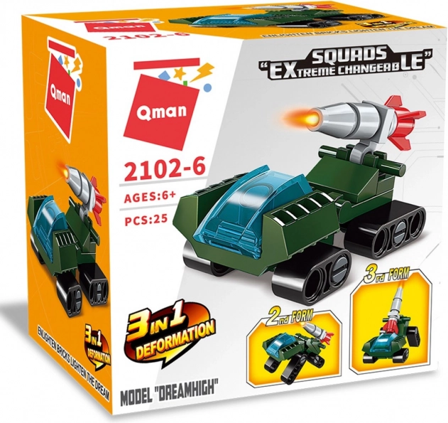 Mini-setul de construcție Qman oferă un raport excelent între distracție și versatilitate într-un pachet mic. Datorită conceptului 3în1, copiii pot construi cu ușurință modele diferite – de la un mic tanc la un vehicul de acțiune – și le pot reconstrui oricând. Setul dezvoltă motricitatea fină, orientarea spațială și creativitatea.