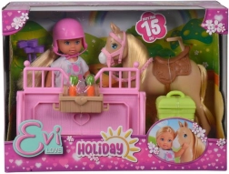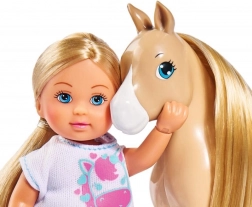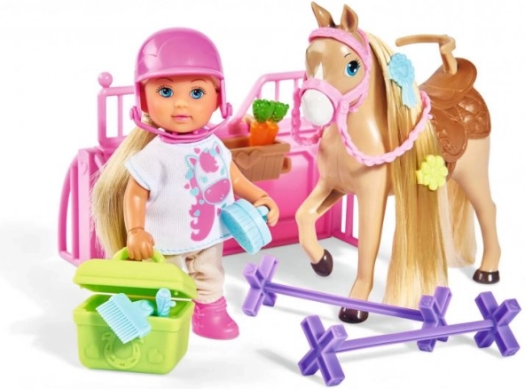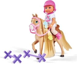 Evička are părul blond lung și un outfit stilat, ideal pentru toate activitățile de echitație. Setul include și numeroase accesorii precum perii, șa și obstacole pentru sărituri galben-roz.