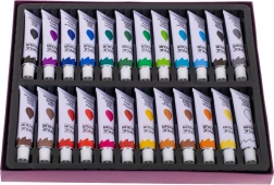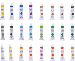 Setul conține 24 de vopsele diferite, fiecare cu un volum de 12ml. Dimensiunile ambalajului sunt 26cm x 22cm x 2cm.