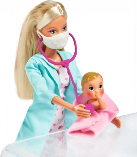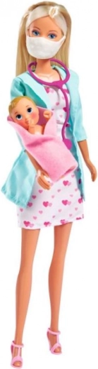 Steffi este îmbrăcată într-un echipament medical roșu și alb cu un halat albastru și poartă o mască medicală. Jocul interactiv cu această păpușă frumoasă dezvoltă empatia și îmbunătățește abilitatea de a îngriji de alții. Cadoul perfect pentru copiii care vor să devină medici!