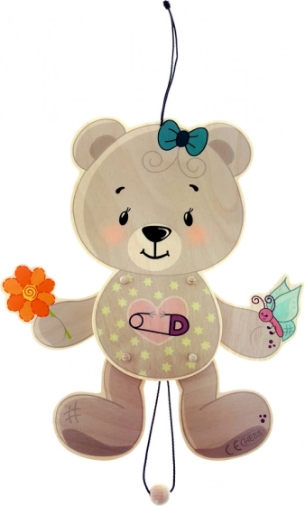 Acest ursuleț suspendat este accesoriul ideal pentru oricare cameră de copii. Este fabricat din 100% lemn de mesteacăn, ceea ce îl face nu doar durabil, ci și ecologic. Părțile sale mobile, care se activează prin tragerea de sfoară, aduc distracție nesfârșită și dezvoltă abilitățile motorii ale copiilor.