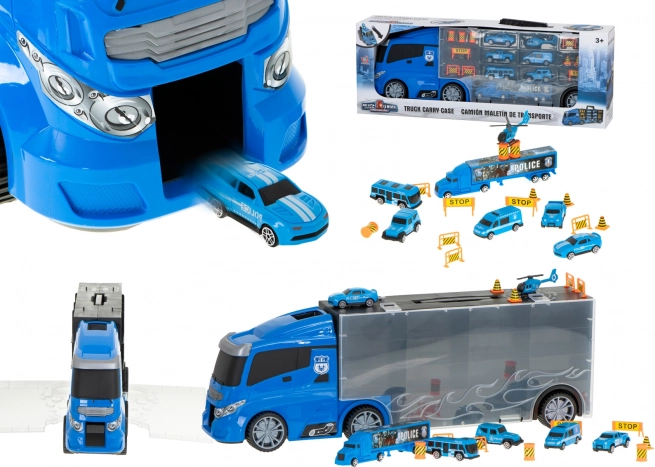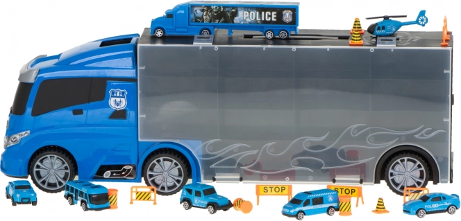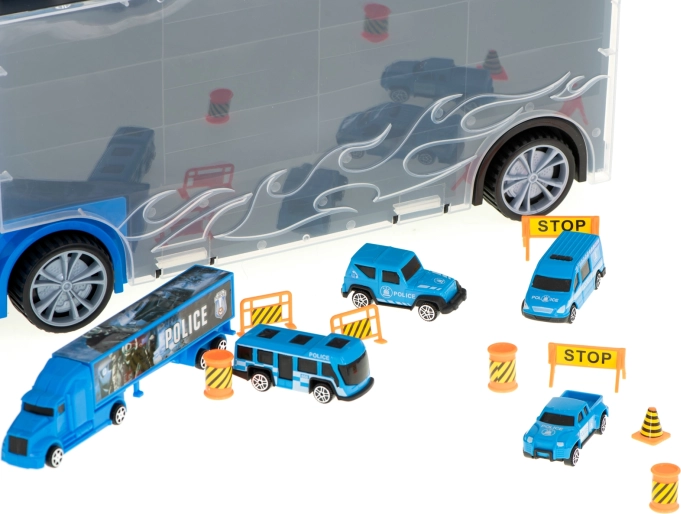 Setul include 6 mașini de poliție din metal, detaliate, și un elicopter, completate de elemente de trafic pentru scene pline de suspans. Transportorul poate găzdui până la 26 de mașinuțe, oferind suficient spațiu pentru noi piese de colecție.