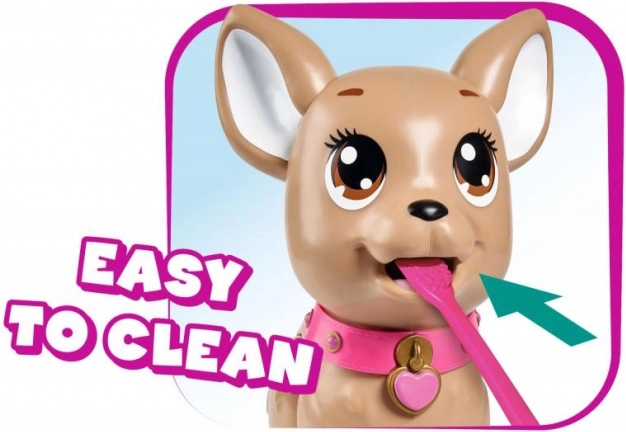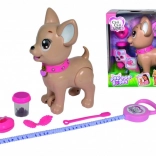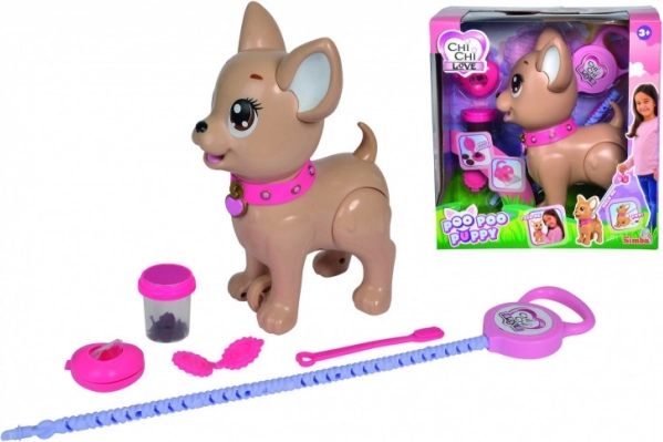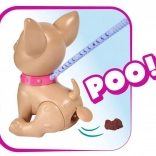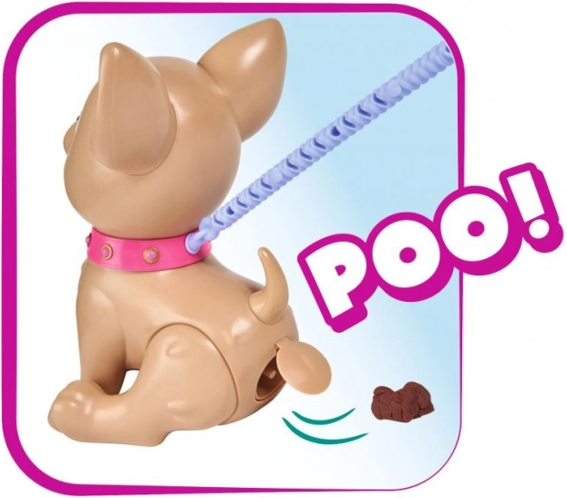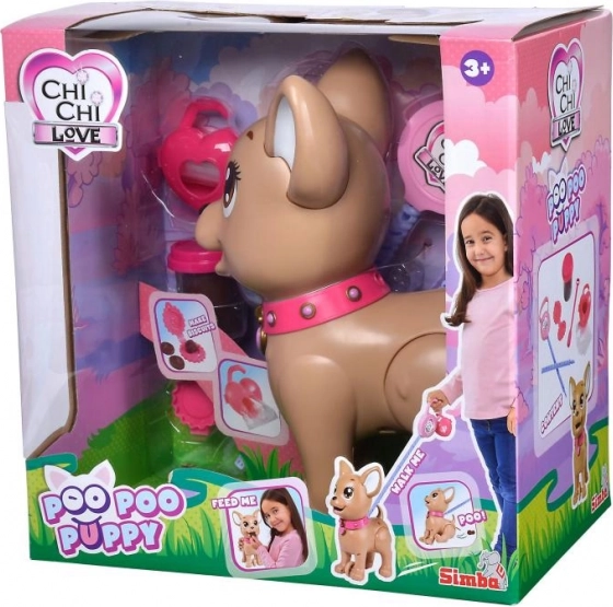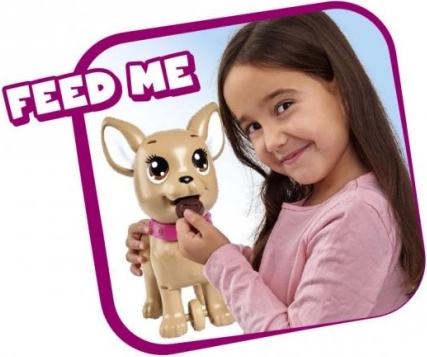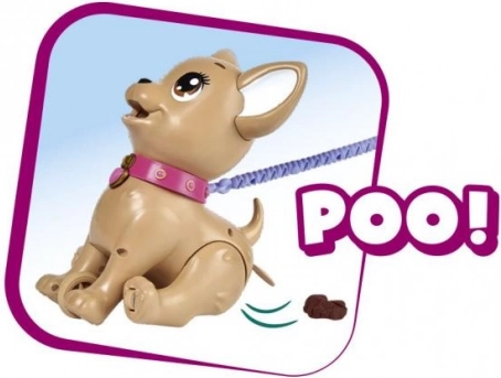 Căţeluşul interactiv chihuahua Poo Poo de la CHI CHI LOVE oferă copiilor un joc realist și totodată sigur de îngrijire a unui animăluț. Modelează o gustare din plastilină, hrănește căţeluşul și pornește la plimbare – la o apăsare ușoară pe lesă, căţeluşul își îndoaie lăbuțele din spate și face o grămăjoară, ce poate fi ușor curățată cu ajutorul punguțelor incluse.