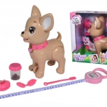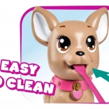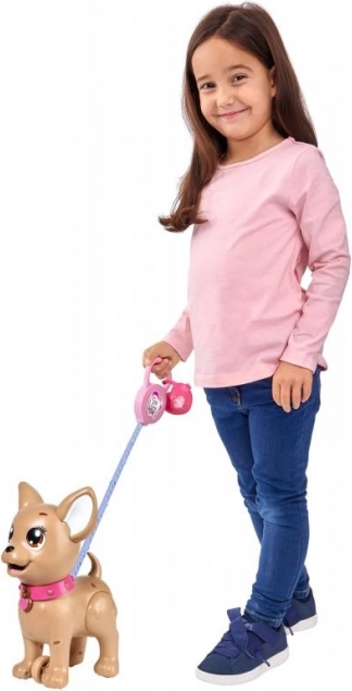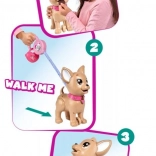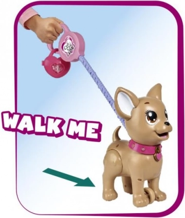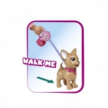Adorabilul căţeluş interactiv chihuahua din colecția CHI CHI LOVE îi învață pe copii să aibă grijă de un animăluț într-un mod distractiv. Hrănește-l cu plastilină, pornește la plimbare și, printr-o apăsare ușoară pe lesă, va face o grămăjoară. Setul include lesă, plastilină, formă de modelare și o cutiuță în formă de inimă cu punguțe pentru curățare ușoară. Căţeluşul are aproximativ 20 cm.