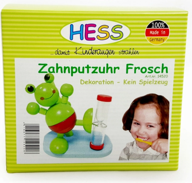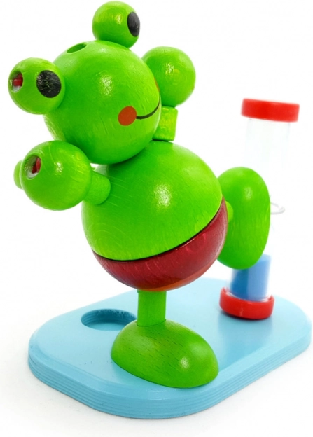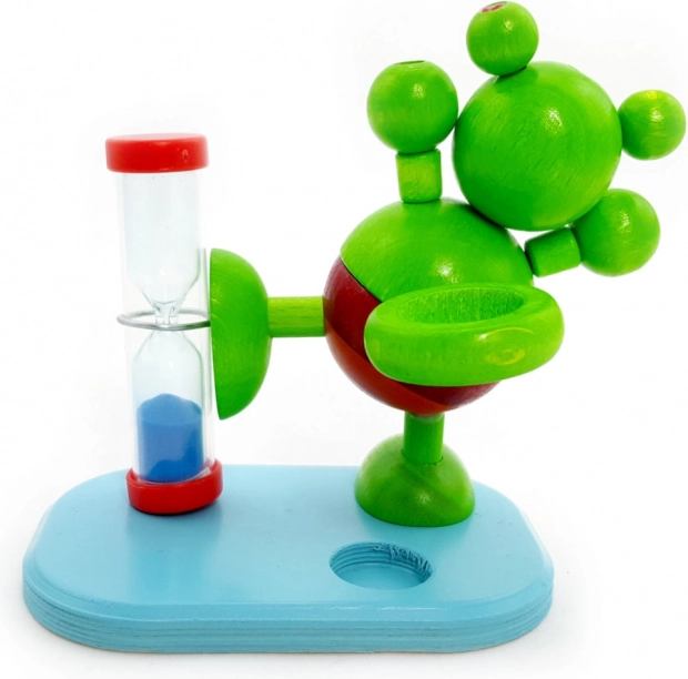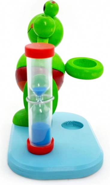 Drăgălașa clepsidră în formă de broscuță transformă periajul dinților într-un ritual distractiv. Intervalul de două minute îi ajută pe copii să respecte timpul recomandat pentru periaj, în timp ce suportul practic pentru periuță păstrează totul la locul lui și la îndemână.
