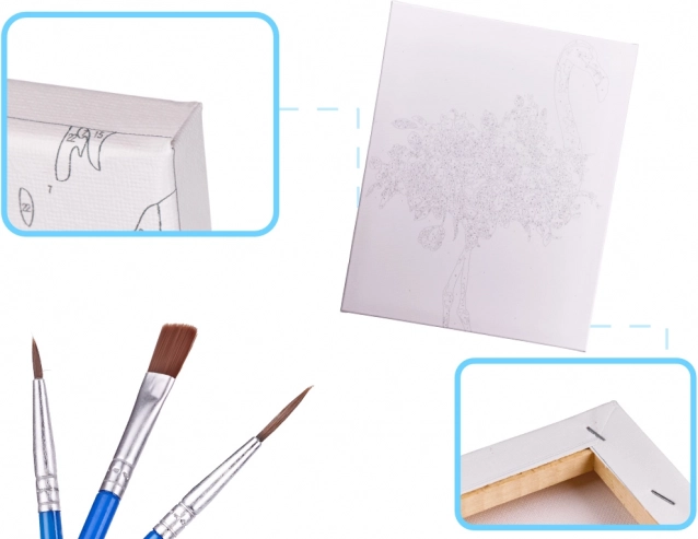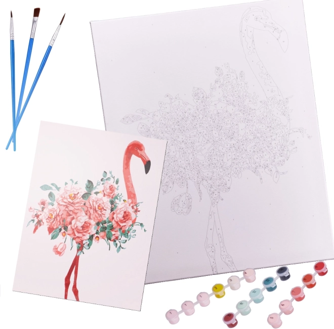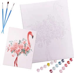 - Kit complet ce include un șasiu de lemn cu pânză imprimată cu model de flamingo.