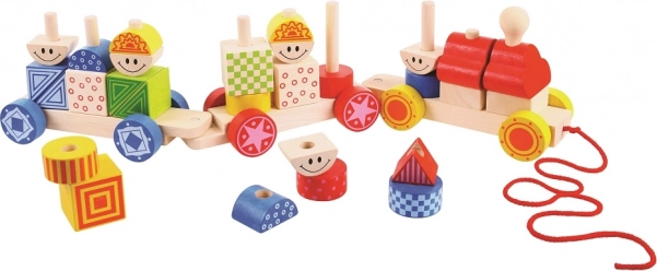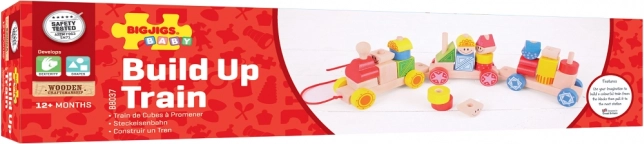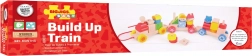 Trei vagoane cuplate și 28 de cuburi de stivuit oferă zeci de combinații. Copiii exersează sortarea culorilor și formelor, motricitatea fină și imaginația.