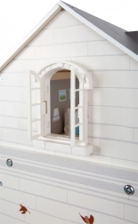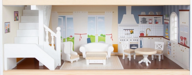 Căsuța pentru păpuși are o fațadă exterioară luminoasă, design modern și elemente funcționale precum uși glisante și ferestre care se deschid.