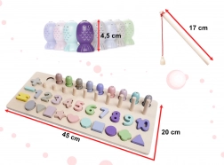 - Conținutul pachetului: bază din lemn, peștișori din lemn, undiță magnetică, cifre și semne matematice 1–10, 10 forme geometrice, 50 de inele pentru numărat.