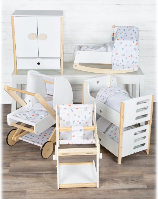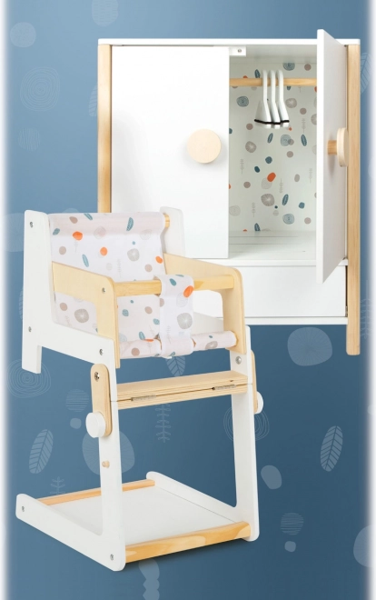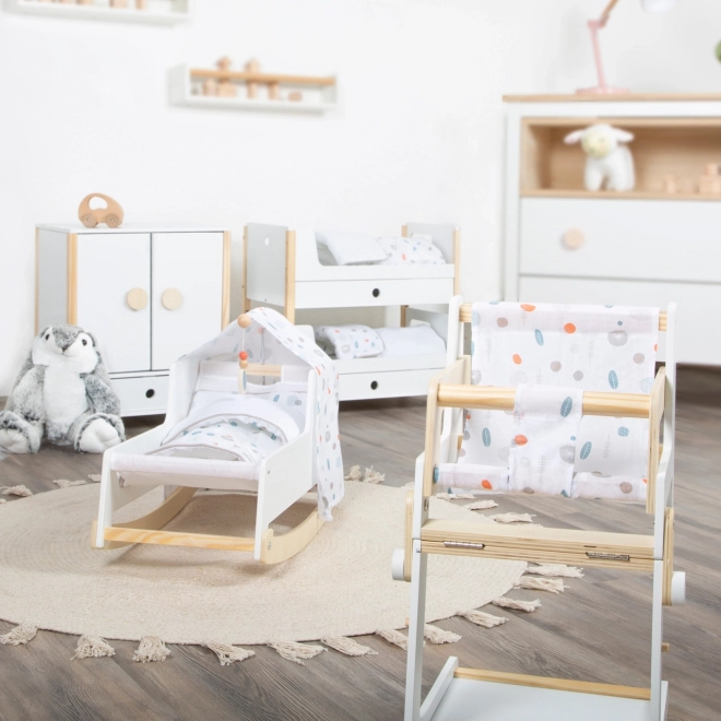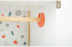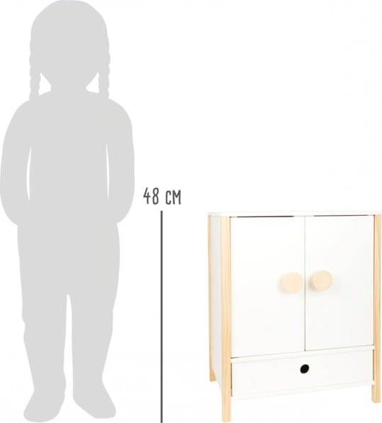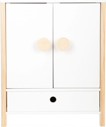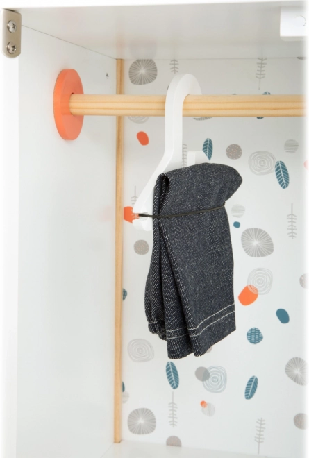 Construcția durabilă din lemn, realizarea stabilă și muchiile rotunjite asigură un joc confortabil și sigur. Dulăpiorul sprijină autonomia, simțul ordinii și dezvoltă imaginația în jocurile de îngrijire a păpușilor.