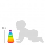 În plus, turnul are o bază rotunjită, astfel încât se leagănă în timpul așezării, ceea ce sporește distracția. Designul colorat susține recunoașterea culorilor și a formelor, precum și a diferitelor dimensiuni.