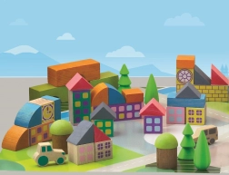 - 40 de cuburi din lemn + planșă de joc pentru construirea sătucului