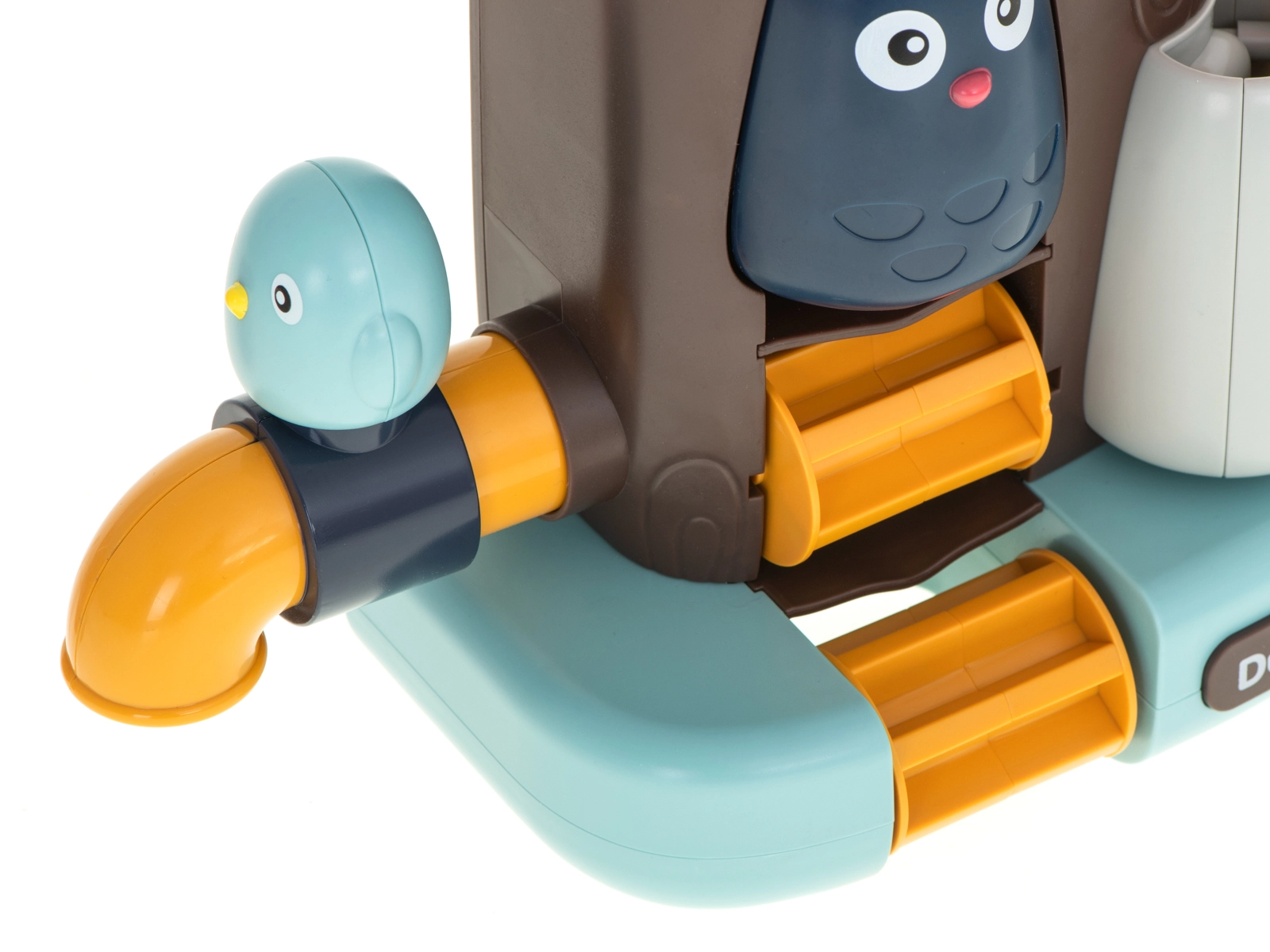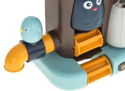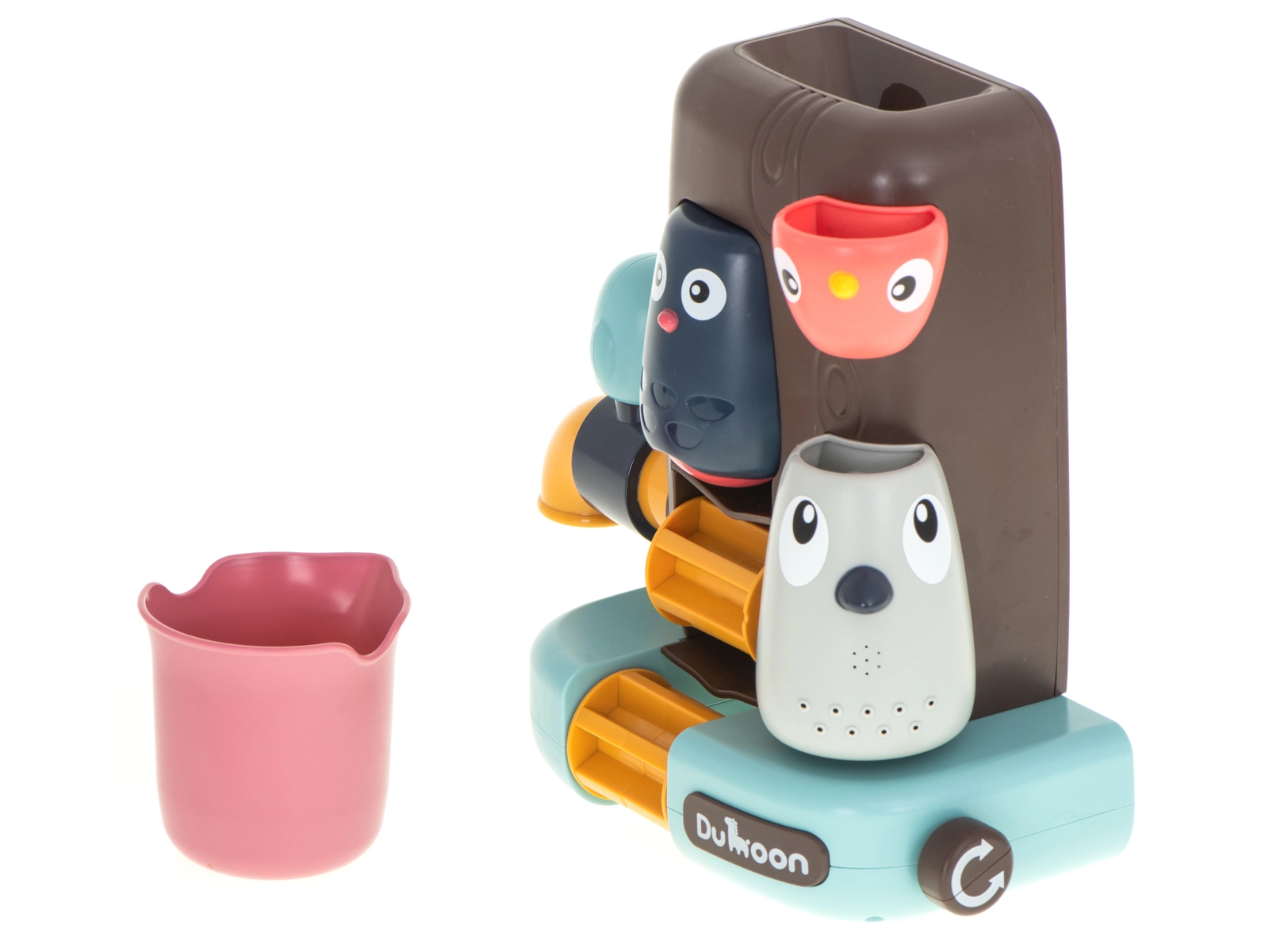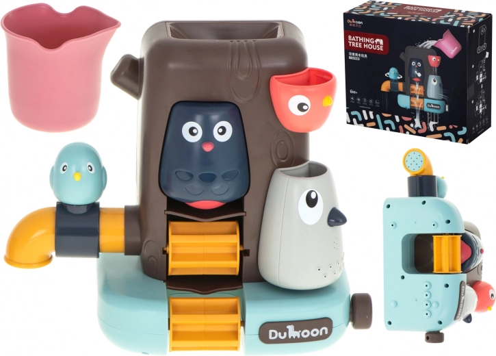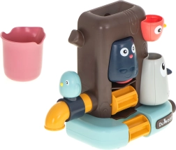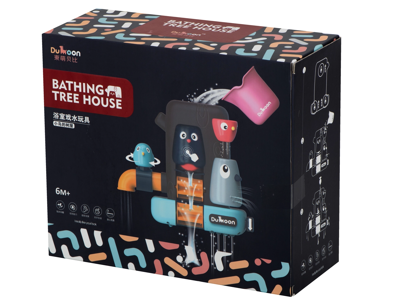 Transformă baia zilnică într-o aventură! Această căsuță colorată în copac, cu păsărele și un robinet funcțional, se fixează pe cadă cu ajutorul ventuzelor și oferă numeroase activități cu apă. Copiii toarnă apă din cănuță și privesc cum se învârte rotița, curge apa din robinet și din păsărică iese o stropire fină ca o dușcă. Excelentă pentru dezvoltarea motricității fine, a gândirii logice și a creativității.