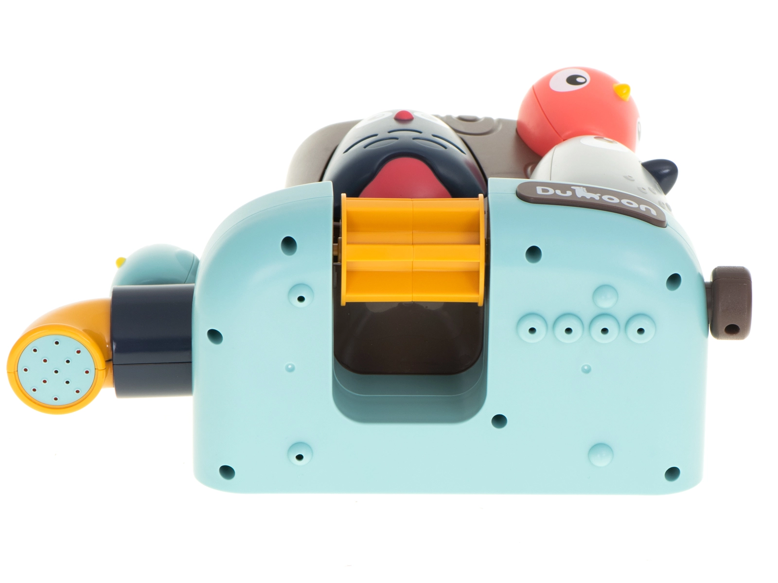 Căsuța veselă în copac, cu păsărele drăgălașe, este motivația ideală pentru copiii care nu prea iubesc baia. Se montează simplu pe cadă sau pe faianță cu ajutorul ventuzelor, o umpli cu apă din cănuța inclusă și distracția începe. Păsărica albastră controlează robinetul – prin rotire oprești sau pornești apa, bufnița supraveghează rotița cu apă, iar păsărica gri creează un efect de duș datorită orificiilor fine.
