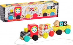 Acest trenuleț modern din lemn are o locomotivă și două vagoane, patru cuburi cu cifre și două animăluțe drăgălașe. Copiii îl pot trage de șnur, pot construi și rearanja cuburile și figurinele, dezvoltându-și imaginația, logica și atât motricitatea fină, cât și pe cea grosieră.
