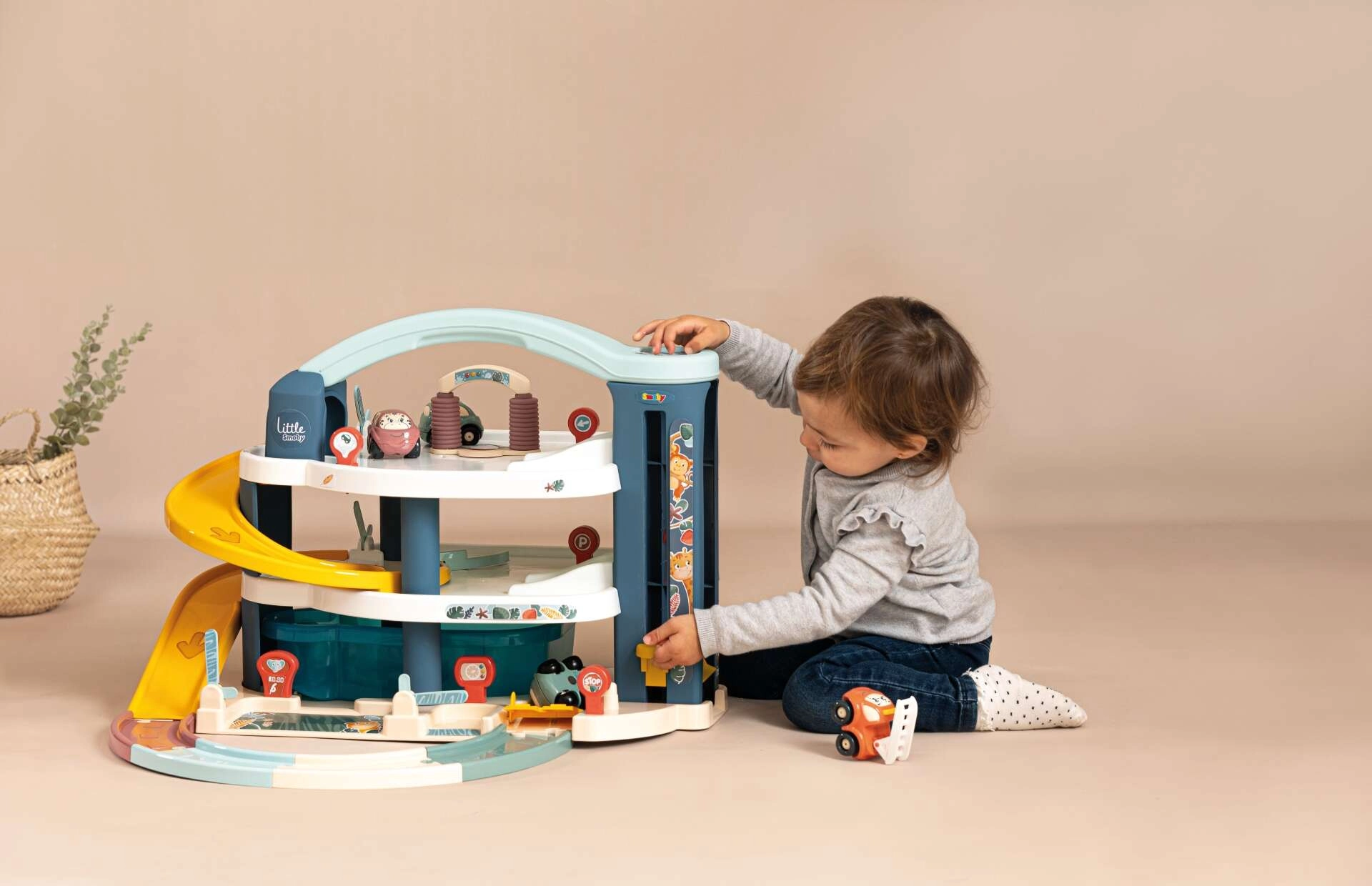Parcarea maxi LITTLE SMOBY oferă copiilor nenumărate posibilități de joacă creativă și motrică. Cele trei etaje sunt conectate de o rampă lungă în spirală, pe care mașinuțele coboară în viteză, în timp ce liftul ușor de manevrat le urcă înapoi. Nu lipsesc spălătoria cu role, stația de alimentare, podul și heliportul pentru elicopterul inclus.