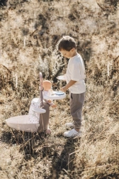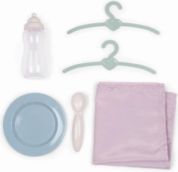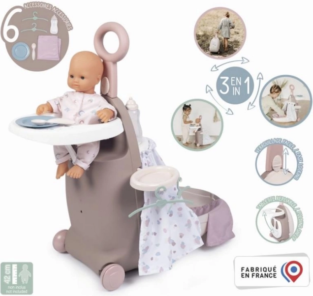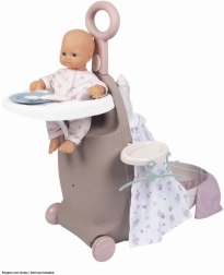 Polițele laterale practice le permit copiilor să depoziteze obiecte mici sau să agațe hainele păpușilor. Setul conține 6 accesorii incluzând farfurii, linguri, biberon și păturică. Valiza poate fi folosită și ca bagaj de călătorie, cu polițe pliabile și roți pentru un transport ușor.