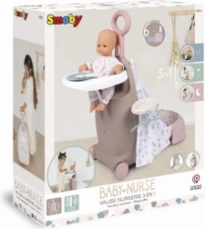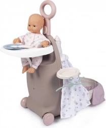 Valiza multifuncțională Smoby Baby Nurse oferă copiilor un centru de îngrijire unic 3în1. Când este deschisă, valiza se transformă într-un scaun înalt cu funcție de masă și accesorii de joacă. A doua parte se transformă într-un pătuț pentru păpușă cu baldachin și păturică.