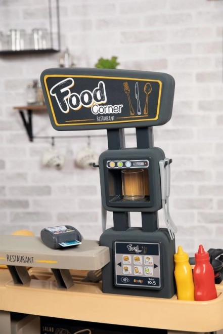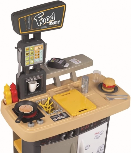 Partea de bucătărie pentru prepararea mâncării și tejgheaua de servire cu casă de marcat și terminal de plată susțin jocul realist de-a restaurantul.