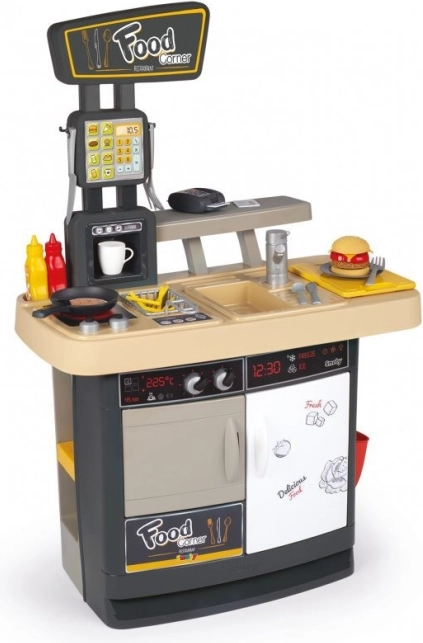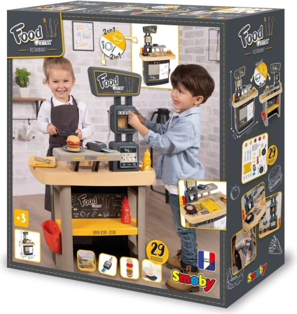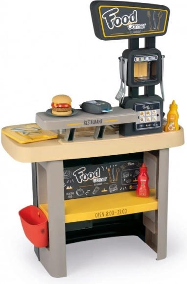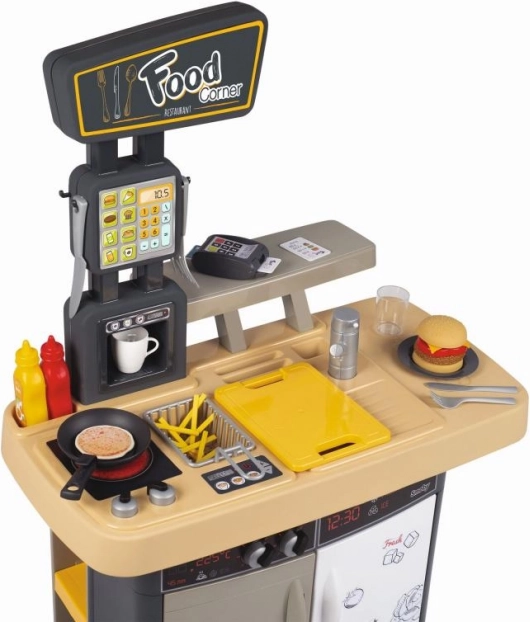 Deschide-ți propriul mic fast-food! Food Corner 2în1 de la Smoby combină o bucătărie și o tejghea de servire cu casă de marcat. Copiii pot pregăti burgeri, cartofi prăjiți sau clătite și, în același timp, pot servi clienții la tejghea – exact ca într-un restaurant adevărat.