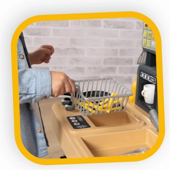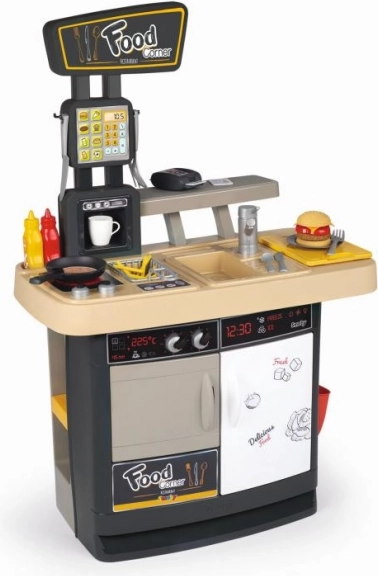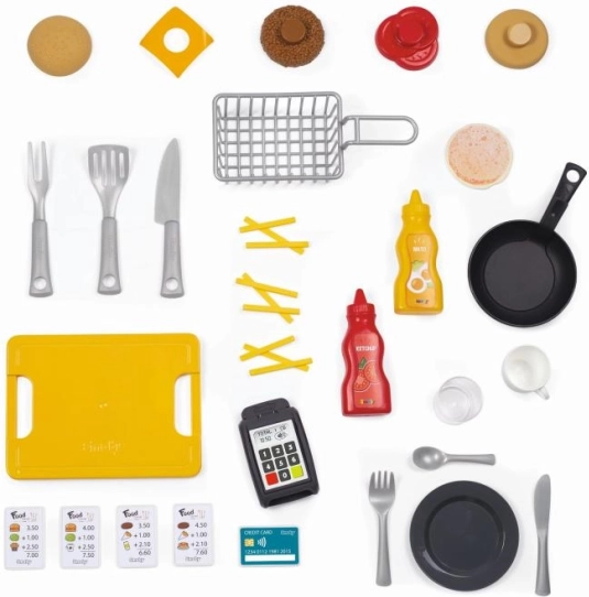 Setul impresionează prin multitudinea de detalii: plită, friteuză, chiuvetă cu robinet, cuptor, frigider, dozator de băuturi, aparat de cafea și cârlige suspendate pentru ustensile. Nu lipsesc terminalul de plată, bonurile, cardul de credit și meniul tipărit. După joacă, resturile pot fi „aruncate” la coș. În total, 29 de accesorii susțin scenarii bogate de joc de rol și dezvoltarea motricității fine.