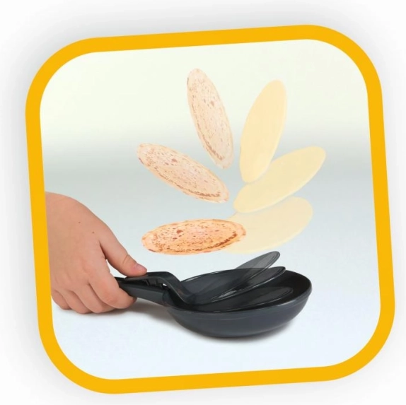 De la tigaie și ustensile până la burger, cartofi prăjiți, sosuri și card de credit. Clătita își schimbă culoarea când este întoarsă în tigaie, pentru și mai multă distracție.