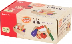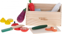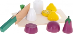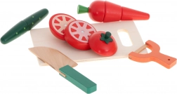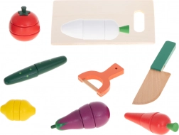 - morcov, păstârnac (ridiche), castravete, roșie (inclusiv felii), lămâie, vânătă, tocător, cuțit sigur, curățător sigur, lădiță din lemn