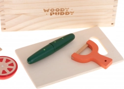 Setul este grozav pentru joaca individuală sau pentru „gătit” împreună cu părinții: susține coordonarea mână–ochi, dezvoltarea vocabularului (denumiri de alimente, părți) și jocul de rol creativ. Lădița estetică din lemn ajută la menținerea ordinii și permite strângerea rapidă.